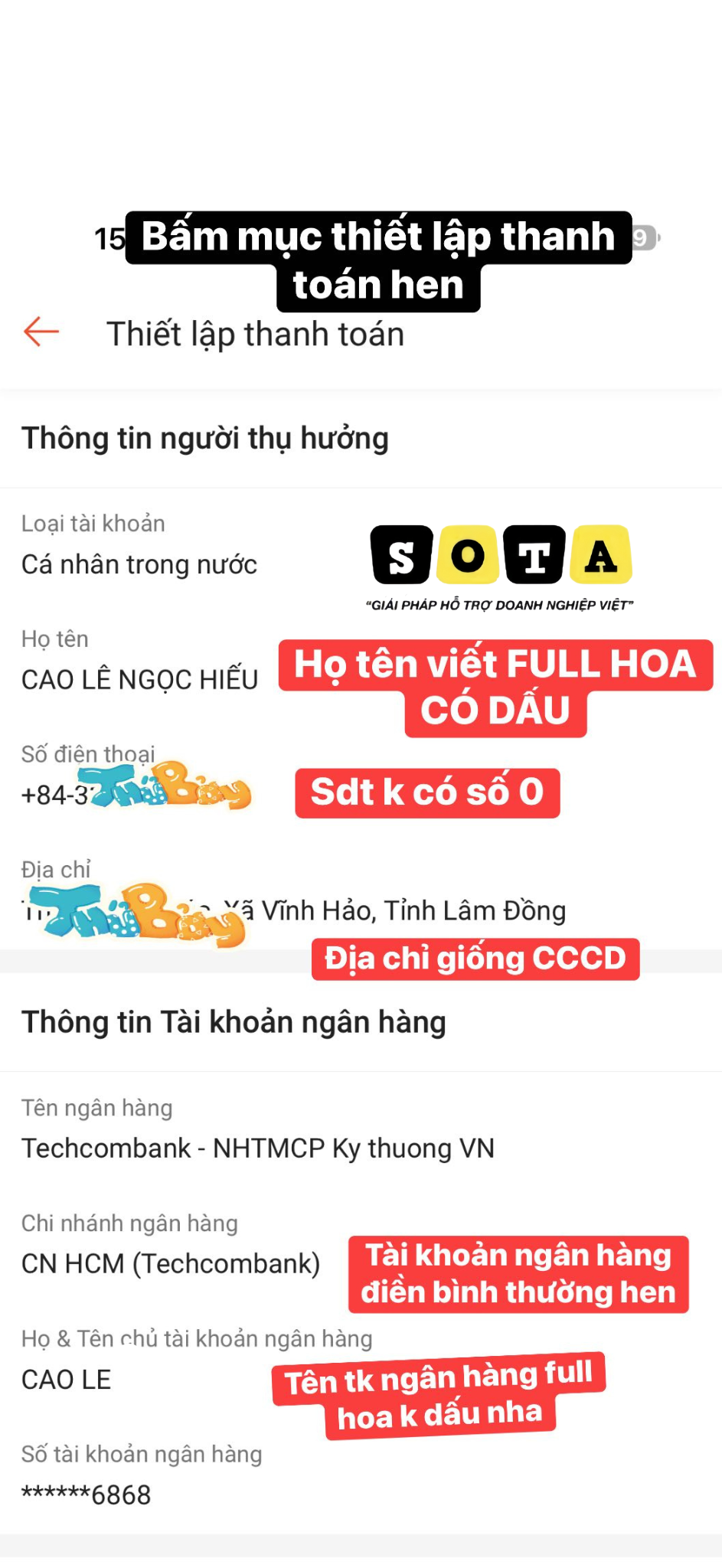 - Số điện thoại: bỏ số 0 đầu ( vì hệ thống đã có mã +84).