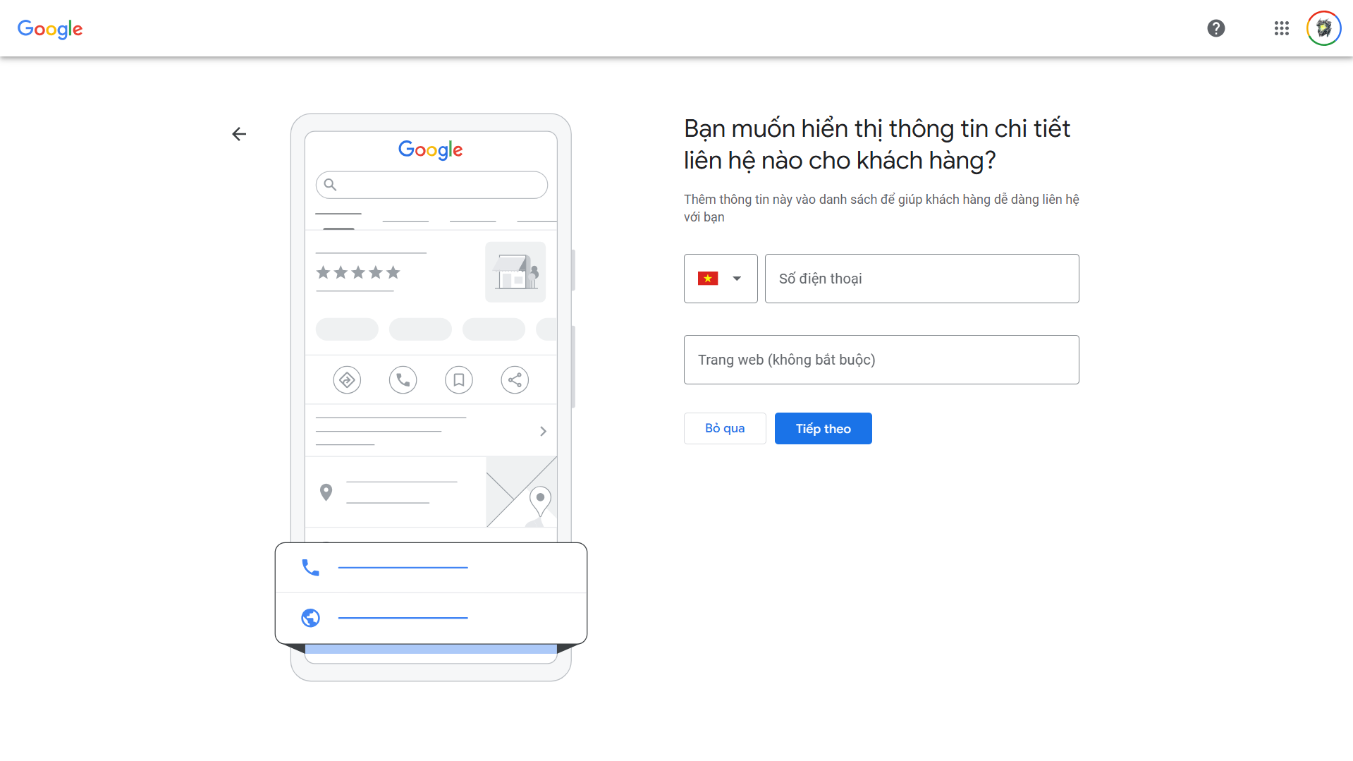 Tại trang này, bạn hãy nhập số điện thoại của doanh nghiệp và địa chỉ trang web (nếu có)