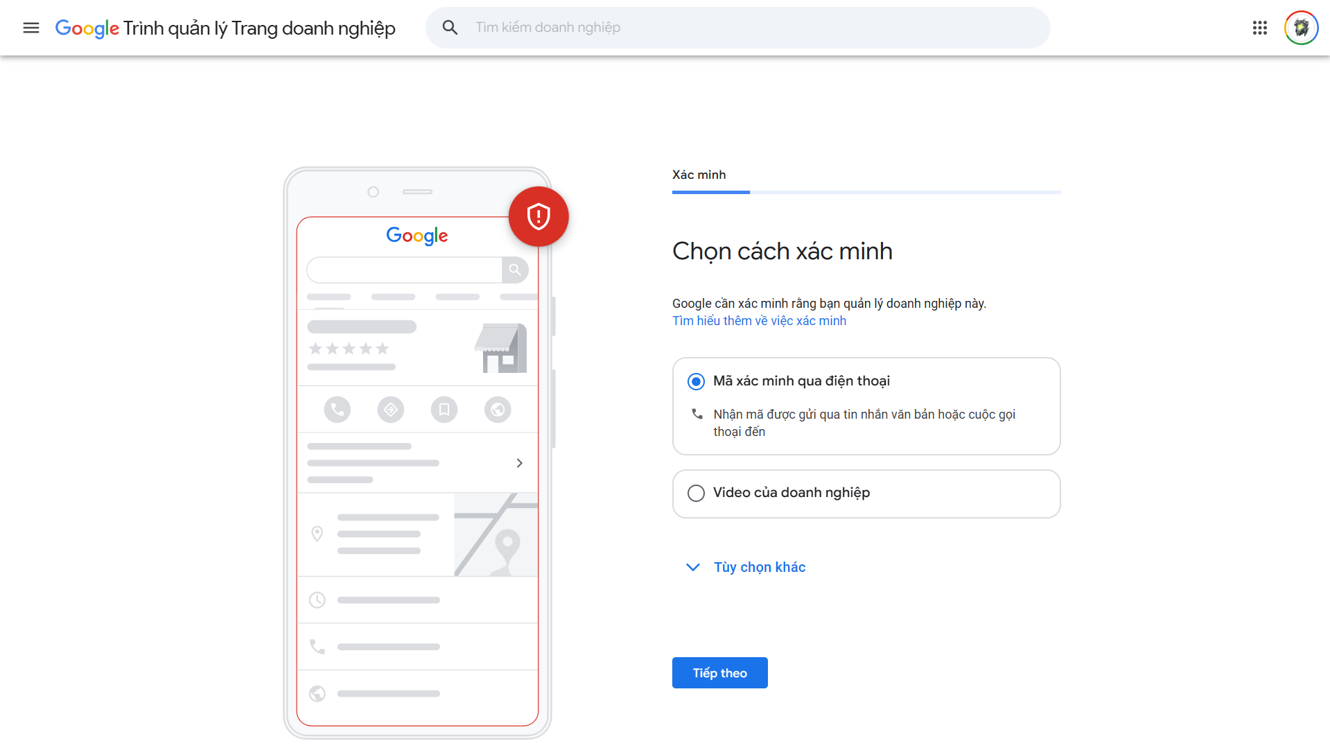 Sau khi đến bước này thì trang doanh nghiệp của bạn về cơ bản đã được tạo và sẽ bắt đầu tiến hành xác minh. Tại đây bạn sẽ có 2 lựa chọn để xác minh là "Mã xác minh qua điện thoại" và "Video của doanh nghiệp"
