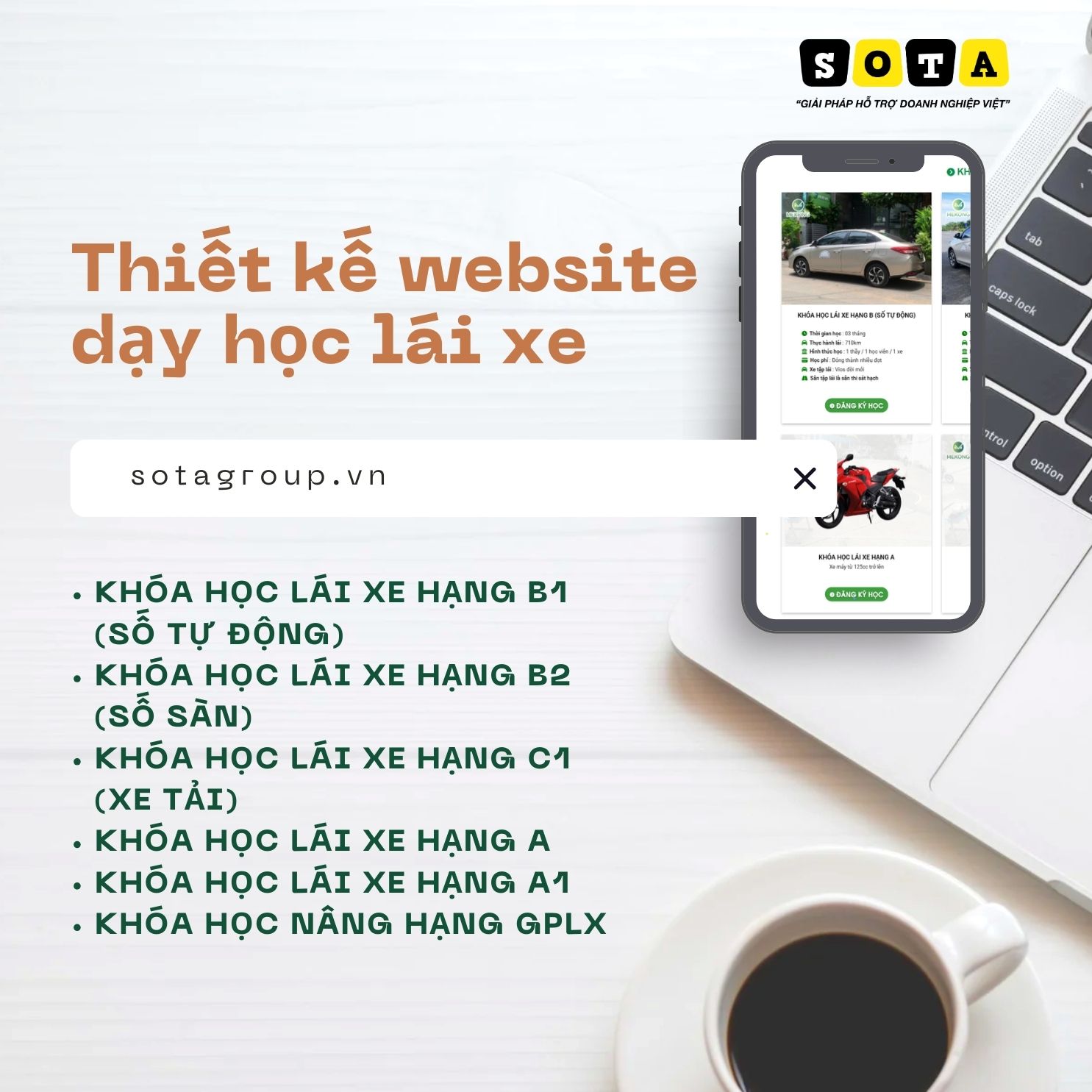 Dịch vụ nâng cấp Website dạy học lái xe của SOTA sẽ tập trung rà soát và tối ưu toàn diện từ giao diện, bố cục nội dung đến các yếu tố kỹ thuật phía sau hệ thống. Website sẽ được cải thiện về tính thẩm mỹ, sự chuyên nghiệp, khả năng hiển thị trên thiết bị di động, tốc độ tải trang và chuẩn hóa các yếu tố SEO theo xu hướng tìm kiếm hiện tại. Nhờ đó, website không chỉ thân thiện hơn với công cụ tìm kiếm mà còn mang lại trải nghiệm dễ hiểu, trực quan và tạo được sự tin tưởng cho học viên khi tìm hiểu khóa học.